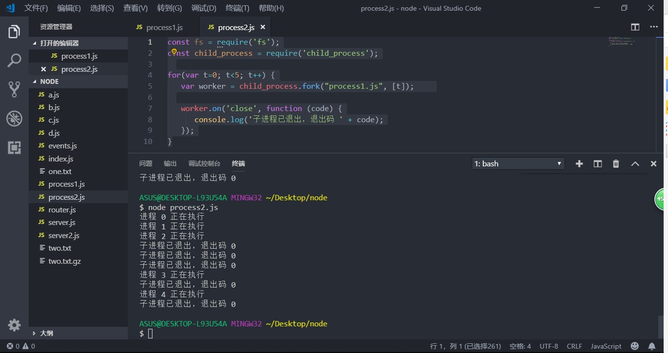 const fs = require('fs');const child_process = require('child_process');for(var t=0; t<5; t++) { var worker = child_process.fork("process1.js", [t]); worker.on('close', function (code) { console.log('子进程已退出,退出码 ' + code); });}