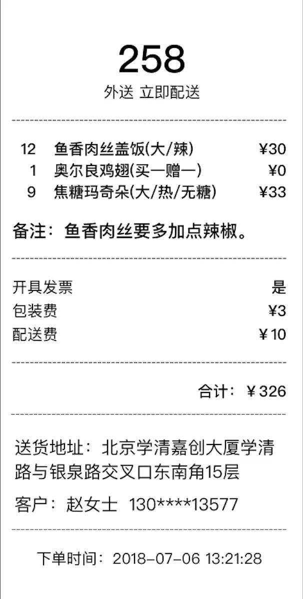 const mockData = { id: 001, delivery_way: '外送', deliver_time: '立即送达', sku_detail: [{ quantity: 10, sku_name: '火米饼套餐', price: 20 }], description: '多放火贝 火火火火', invoiced: '', package_fee: 1, deliver_fee: 10, total_price: 31, receiver_address: '火星1区101路1号', receiver_name: '火星人', receiver_phone: 00001, create_time: '0001-01-01', tagg_shop_name: '火星1号商店'}