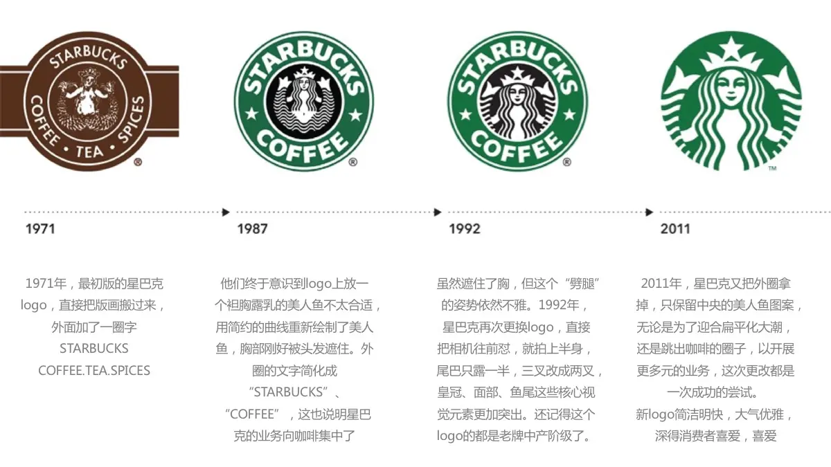 自1971年成立以来,星巴克已经使用了三个标识,每个标识都显示了一条双尾美人鱼(或希腊神话中的海妖)的不同演绎。