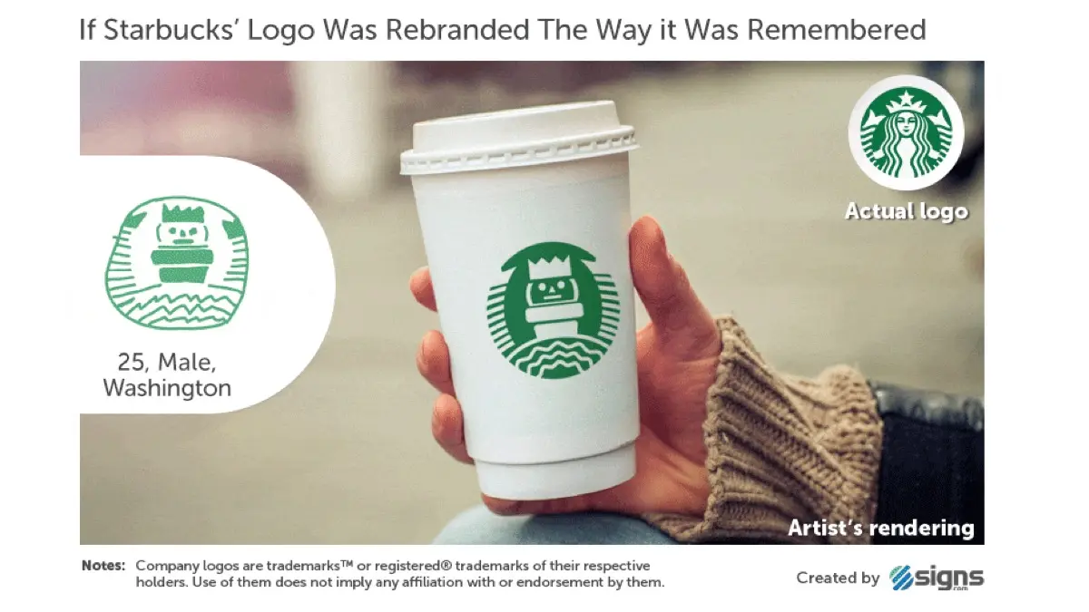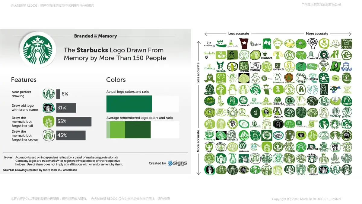 毫无疑问,星巴克的美人鱼是非常令人难忘的(90%的人包括她),但她足够复杂,很少有人能准确地回忆起她的身材细节。56%的人忘记了美人鱼的王冠在“星巴克美人鱼”的画像中,45%的人忘记了她戴着王冠,16%的人记得照片中央的美人鱼,55%的人忘记了她的双尾巴。31%的人记得2011年之前的星巴克标志,标志上有品牌名称和一个黑色圆圈。