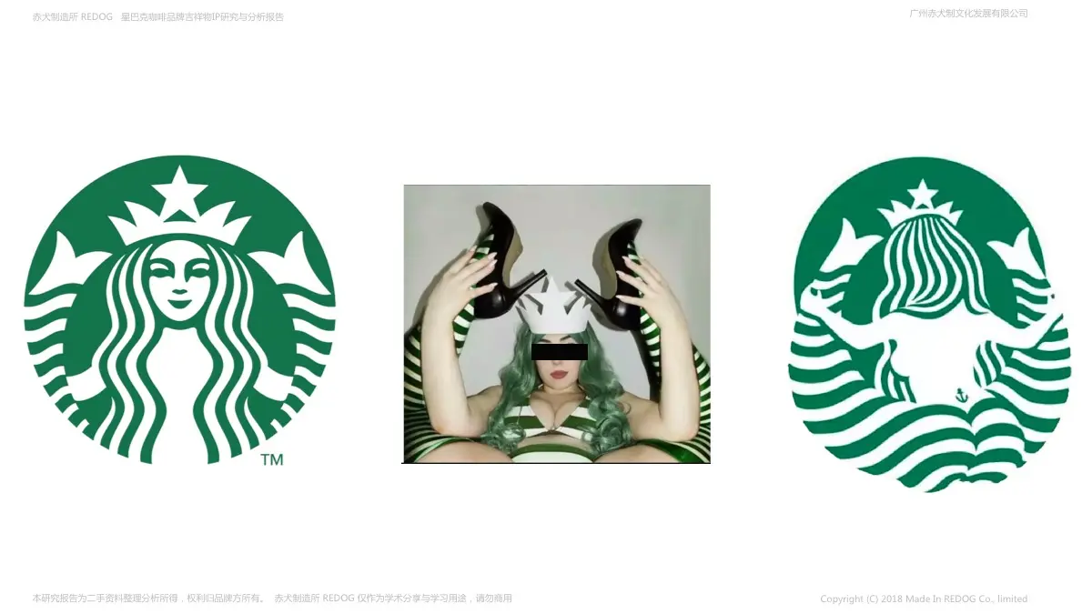 在logo的第一个版本中,美人鱼是上身赤裸的,但是在1987年,logo被简化了,用飘逸的头发遮住她的胸部,把主色调从棕色变成绿色。