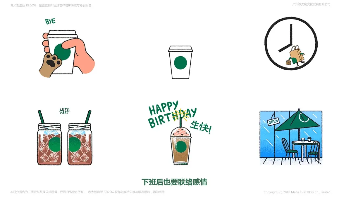 这组表情包是由艺术家 Mario 为星巴克创作的。他来自马德里,现居伦敦,喜欢到处旅行,也喜欢社交,擅长用自己独特的艺术视角表达那些丰富多彩,稀奇古怪的故事。 Mario与ZARA,福布斯杂志,电讯报,连线杂志等数十家著名报刊杂志出版社及时尚品牌合作过 延续了标志性的绿色作为主体视觉,这一组“星”表情捕捉到了一天中的各种细节和场景。24个小时,24个表情,无论你想表达什么,总能找到合适的。