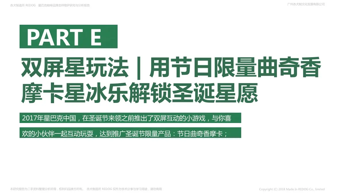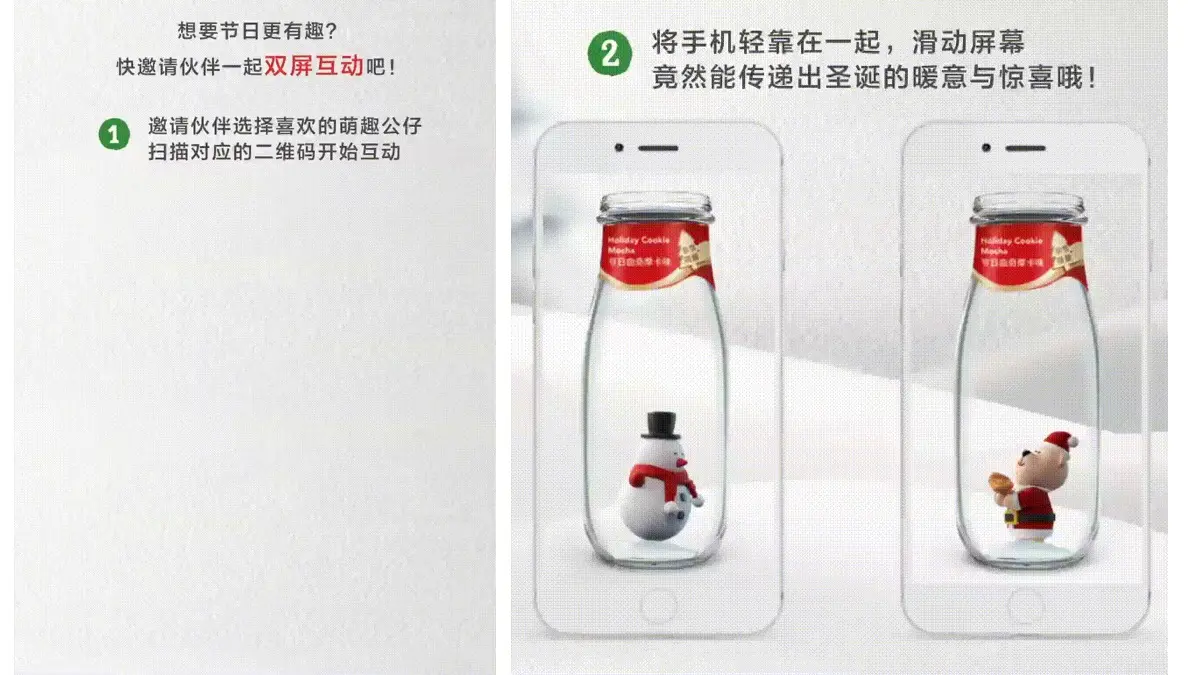 2017年星巴克中国,在圣诞节来领之前推出了双屏互动的小游戏,与你喜欢的小伙伴一起互动玩耍,达到推广圣诞节限量产品:节日曲奇香摩卡;
