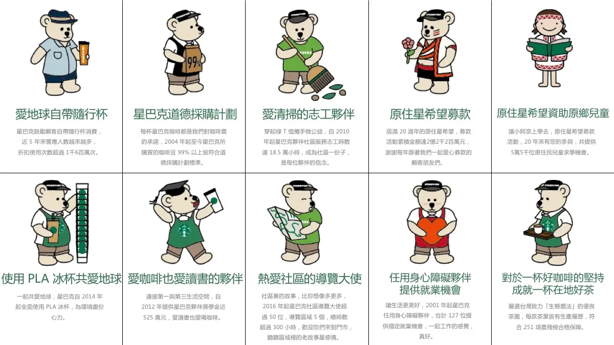 爱地球自带随行杯,星巴克道德採购计划,爱清扫的志工伙伴,原住星希望募款,原住星希望募款,使用 PLA 冰杯共爱地球 ,爱咖啡也爱读书的伙伴,热爱社区的导览大使,热爱社区的导览大使,任用身心障碍伙伴提供就业机会,对于一杯好咖啡的坚持成就一杯在地好茶