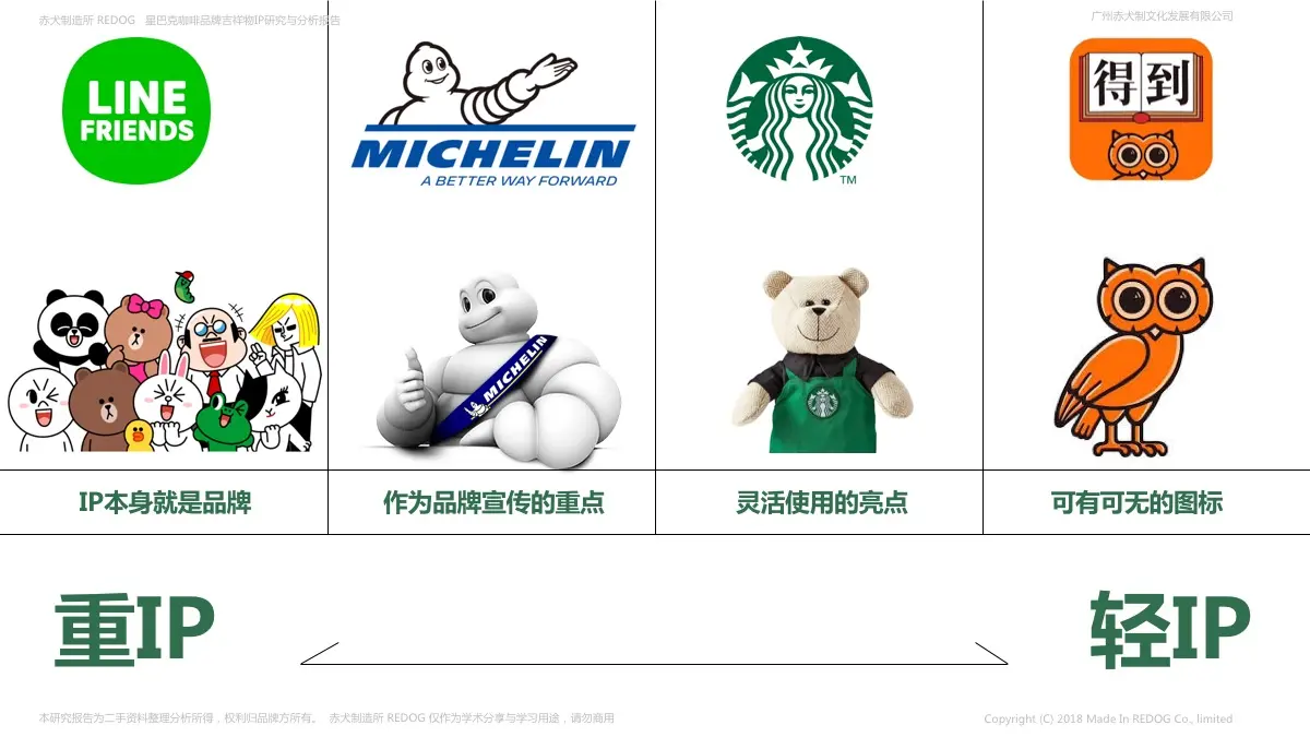 赤犬制造所把IP的使用权重和使用方式分为了四个层次:从左到右为重IP到轻IP;