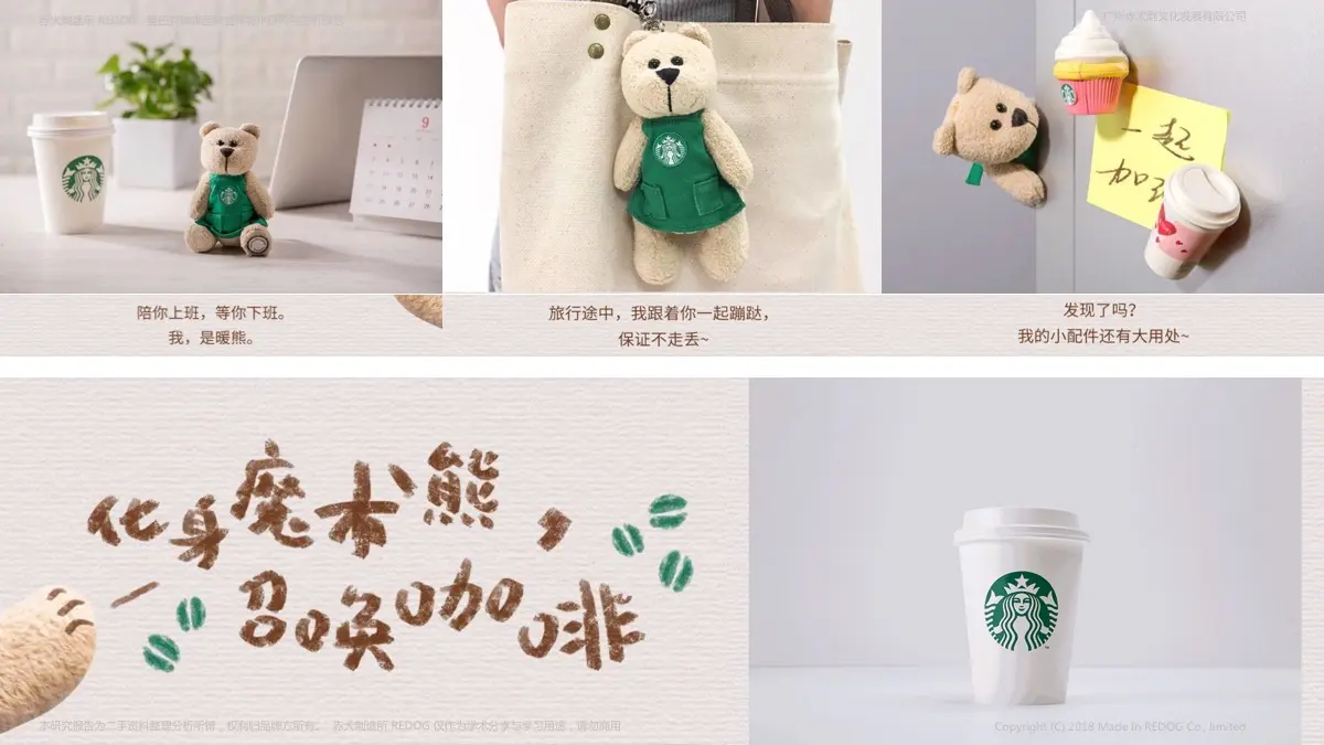 而星巴克的咖啡熊成能灵活使用在节庆宣传和周边开发中,成为星巴克宣传的亮点;