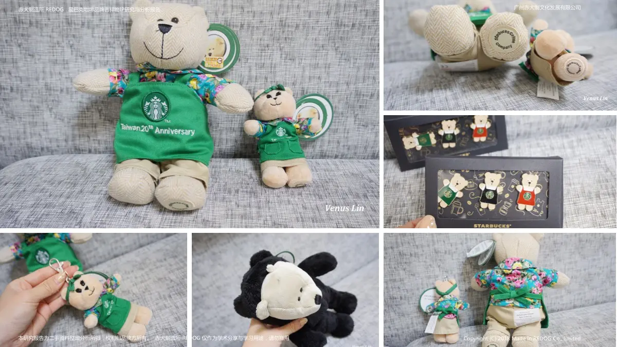 ▲台湾星巴克限定商品:20週年纪念小熊、购物袋、零钱包、随行卡,还有台湾特别版:黑熊外套,黑熊的衣服还可以脱下来育。原来小熊穿了也是有台湾FU的花布衬衫。