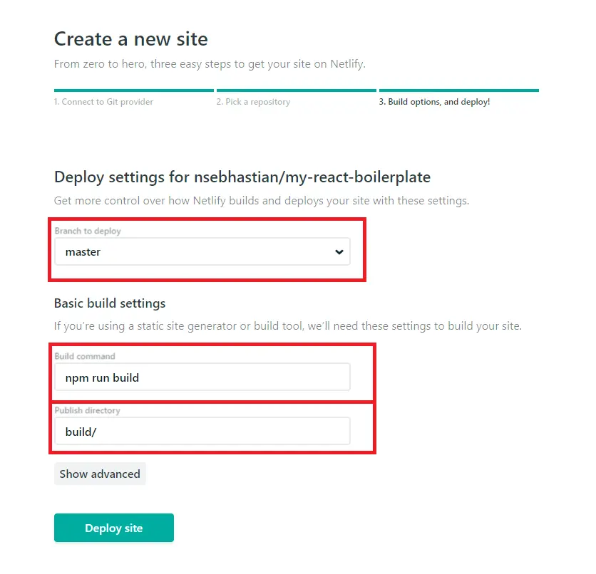 Now you need to enter the build command and publishing directory. As you can see, this is why we need HtmlWebpackPlugin, because we need to serve everything from one directory only. Rather than manually updating our root index.html file for changes, we just generate it using the plugin.