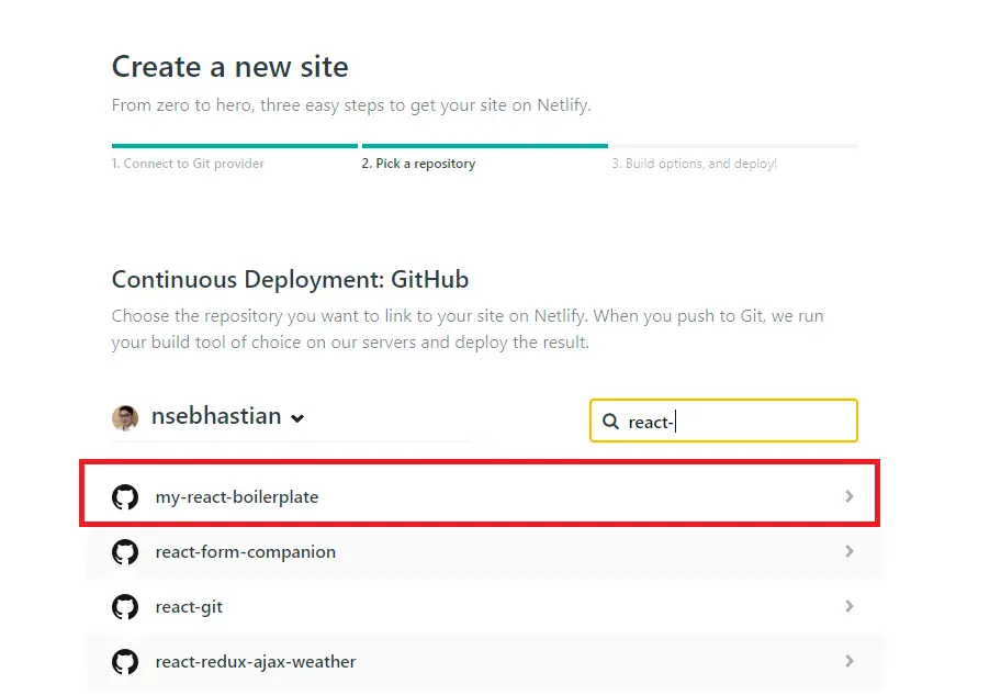 You need to grant permissions for Netlify, and then select your React boilerplate repo.
