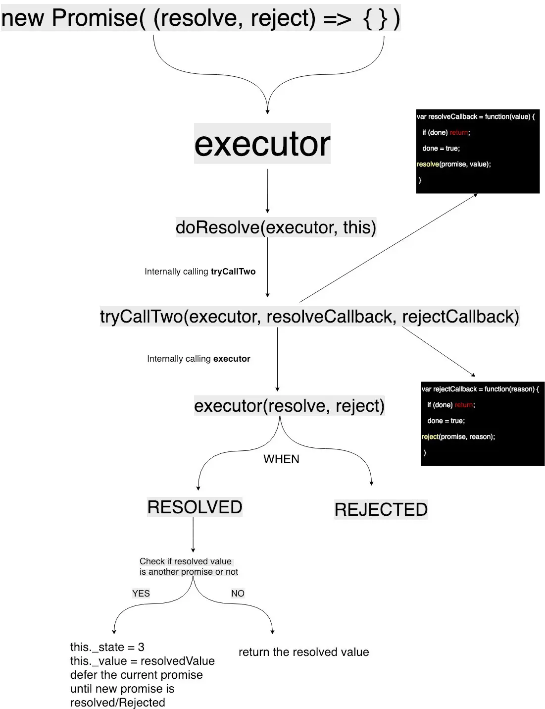 /*** Take a potentially misbehaving resolver function and make sure* onFulfilled and onRejected are only called once.** Makes no guarantees about asynchrony.*/function doResolve(fn, promise) {var done = false;var resolveCallback = function(value) {if (done) return;done = true;resolve(promise, value);};var rejectCallback = function(reason) {if (done) return;done = true;reject(promise, reason);};var res = tryCallTwo(fn, resolveCallback, rejectCallback);if (!done && res === IS_ERROR) {done = true;reject(promise, LAST_ERROR);}}Here it is again calling tryCallTwo function with executor and 2 callbacks. The callbacks are again calling resolve and reject