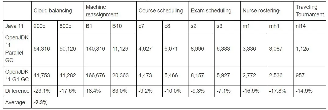 OptaPlanner 表示,从 Java 8 到 Java 11,G1 GC 的平均速度改进为 16.1%,并行 GC 为 4.5%。