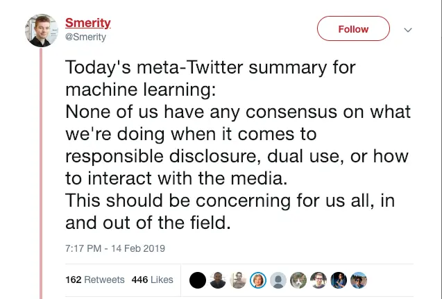 Stephen Merity 对社交媒体的回应进行了总结,他感叹机器学习社区在这方面的经验不多: