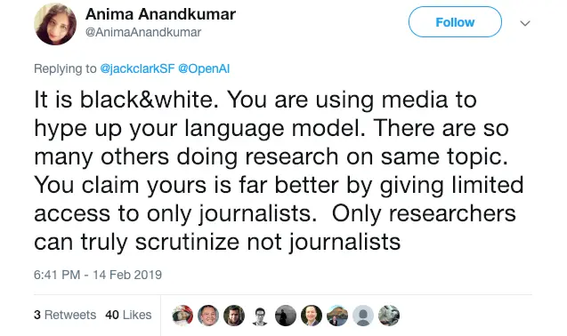 Anima Anankumar 致力于机器学习理论和应用的协调发展。 她在推特上对 OpenAI 决定发布模型的回应是: