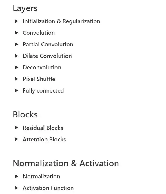 目前整个项目包含 20 种代码块,它们可用于快速搭建深度学习模型: