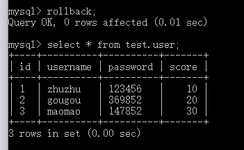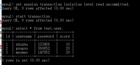 例子:事务1设置隔离级别为读未提交,查询user表数据。