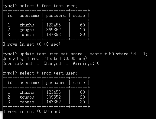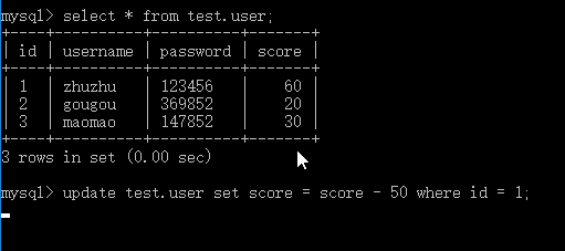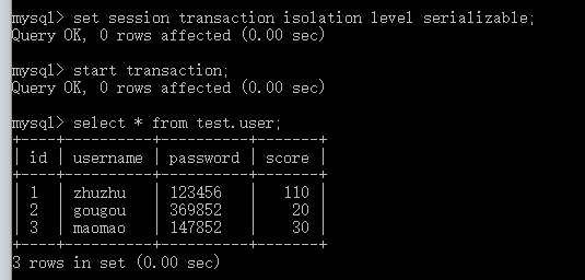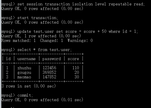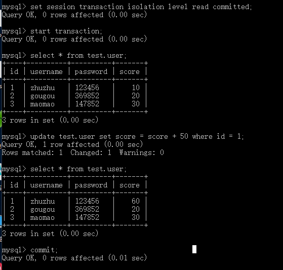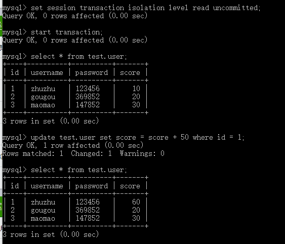 事务2设置隔离级别为读未提交,修改user表id为1的score。