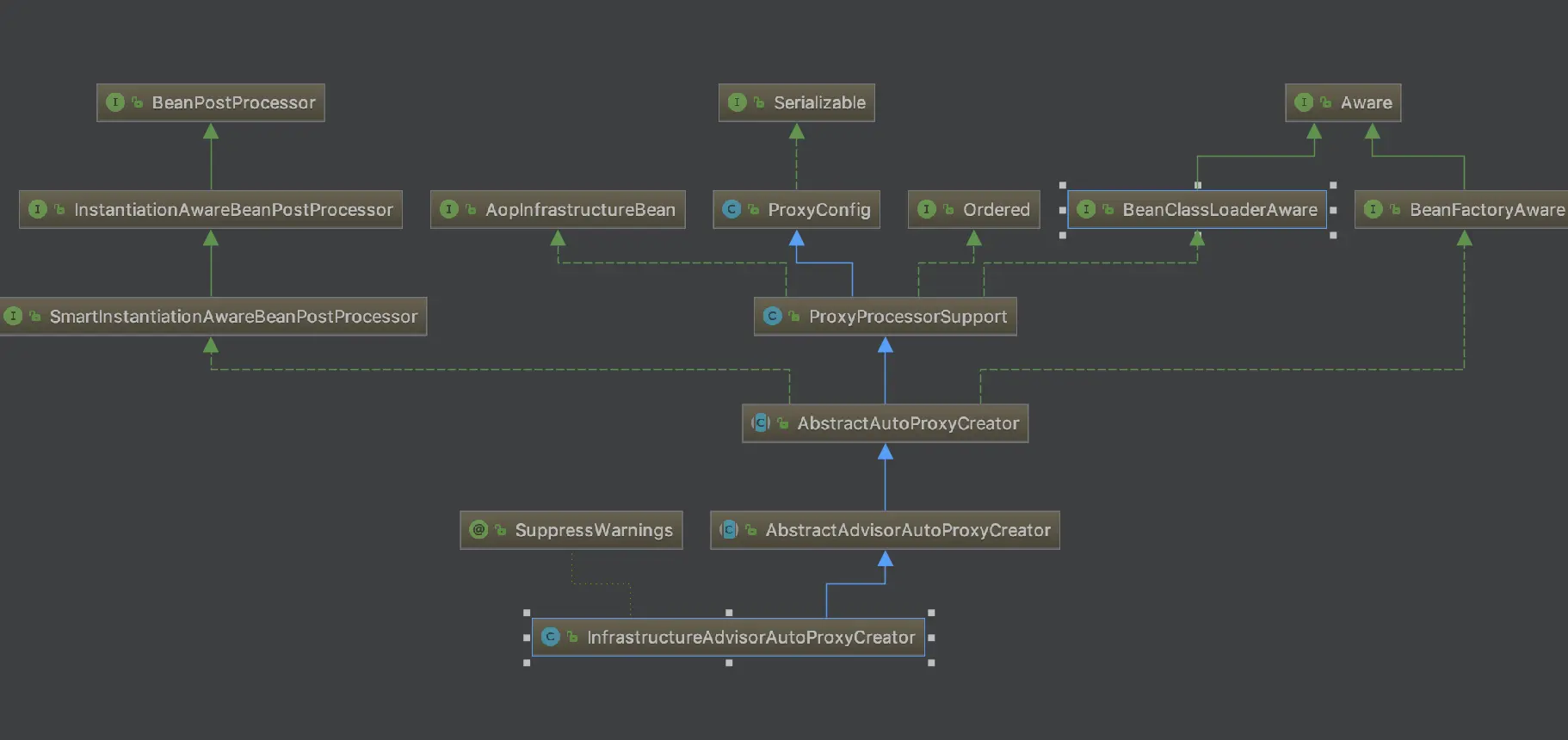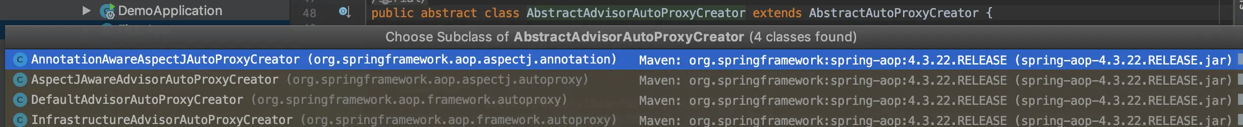 - 在AopConfigUtils可以看到具体会生成什么类型的AutoProxyCreator,这几个都是beanPostProcessor,在Bean创建之后对Bean的实例进行自定义处理。如果使用了@EnableTransactionManagement,经过一些配置这次生成的是InfrastructureAdvisorAutoProxyCreator,具体如何生成这个类的点进去@EnableTransactionManagement里面即可。