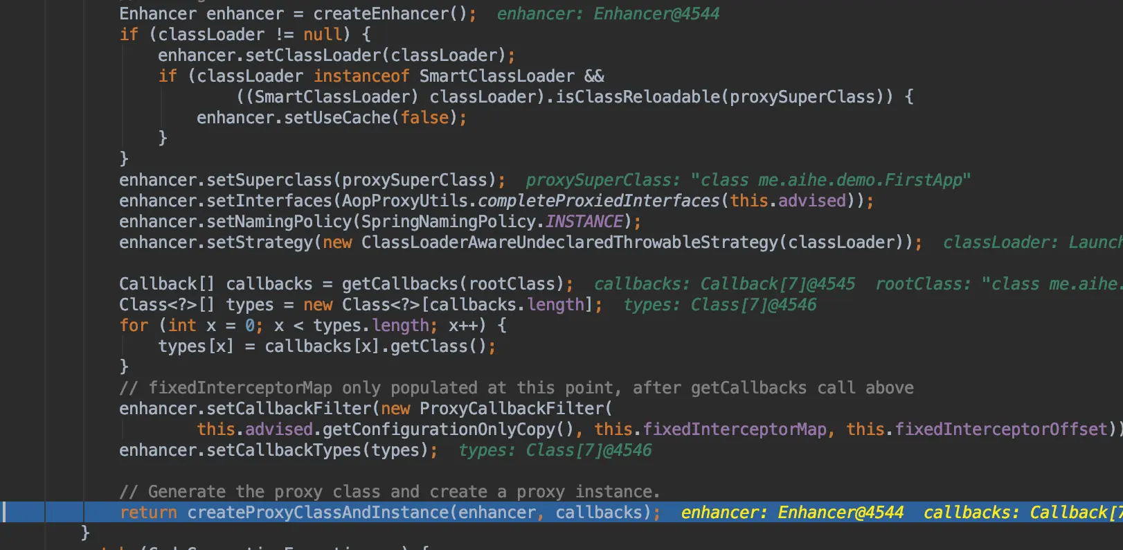 比如FirstApp生成的动态代理名称为FirstApp$CGlibxxx,这个时候通过getTarget获取的对象即为FirstApp的实例。