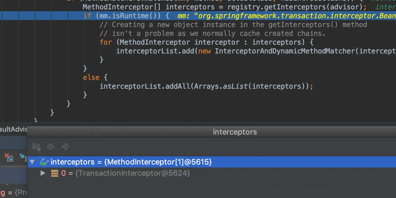 得到的拦截器为事务拦截器,既然是事务拦截器,那么可以跟上之前的分析了。