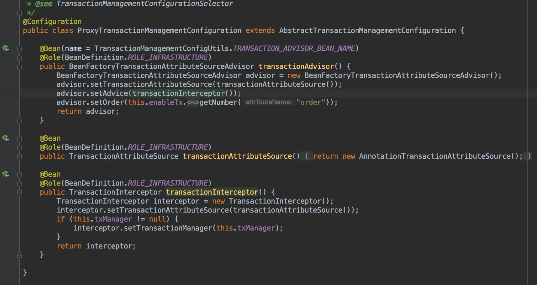 - 在默认的@EnableTransactionManagement注解中,将BeanFactoryTransactionAttributeSourceAdvisor的advice设置为TransactionIntercetor,这一步的注解生效,我们第一步就已经讲过了。