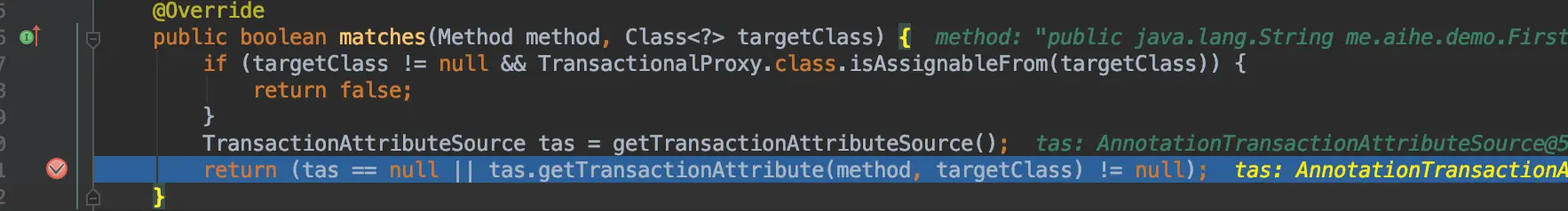 - 方法是如何匹配的,TransactionAttributeSourcePointcut中matches方法,调用TransactionAttributeSource属性判断是否有method的属性