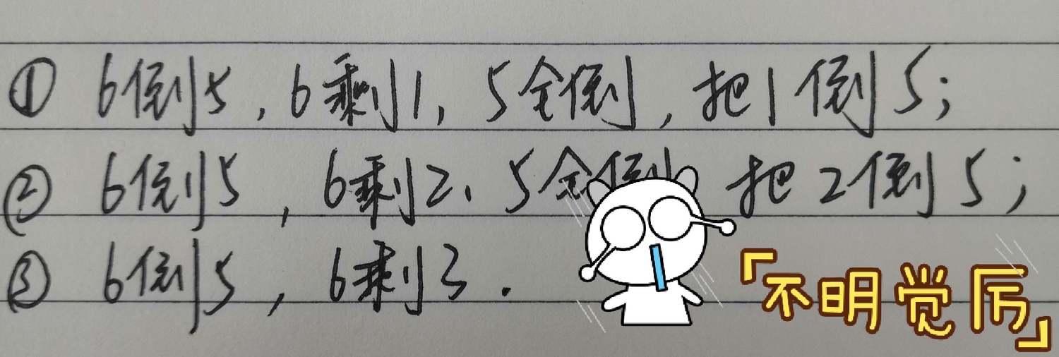 - 装满5,倒入6中至6满,5中还剩3kg.