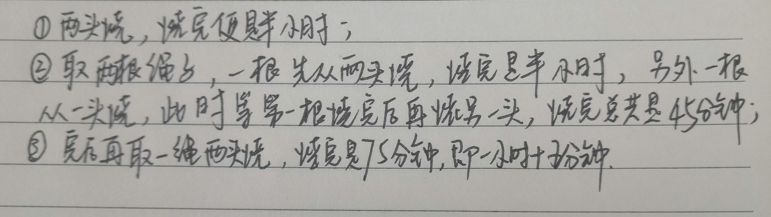 2.烧一根不均匀的绳从头烧到尾总共需要1个小时,如何用它来判断半个小时?现在有3条材质相同的绳子,问如何用烧绳的方法来计时一个小时十五分钟呢?(10分)