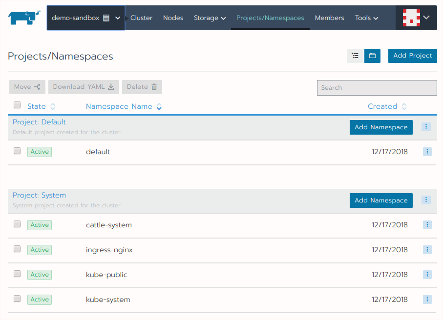 在选择了集群之后,你可以通过访问Projects/Namespaces选项卡来查看集群中可用的项目: