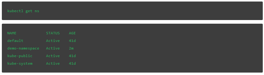 无论我们采用哪种方法创建命名空间,在我们再次检查可用命名空间时,应该能列出新的命名空间(我们使用ns——命名空间的缩写,第二次进行查询):