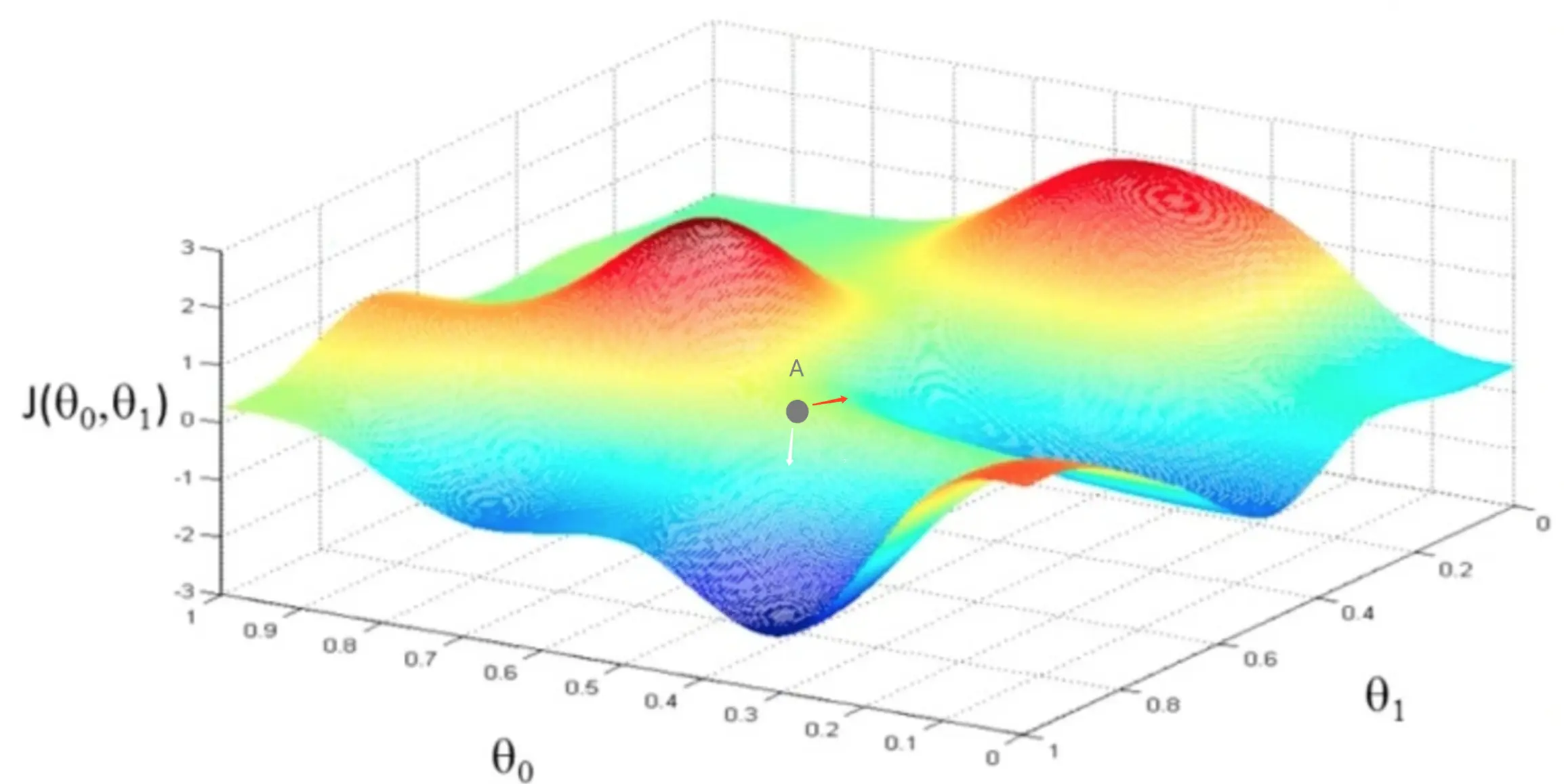 首先我们需要明白固定的数据集顺序,意味着给定迭代步,对应此迭代步的训练数据是固定的。 假如目标函数是J=f(w1, w2),使用梯度下降优化J。给定权重取值w1、w2和迭代步step的情况下,固定的数据集顺序意味着固定的训练样本,也就意味着权值更新的方向是固定的,而无顺序的数据集,意味着更新方向是随机的。如下图中的A点,如果固定的更新方向是红色箭头方向,则很难收敛到最优点,而如果更新方向是随机的,则有可能就沿着白色箭头方向收敛到最优点。