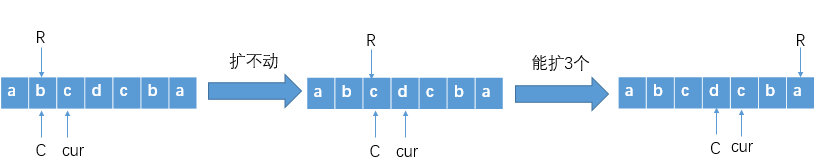 R:遍历过程中,“扩”这一操作扩到的最右的字符的下标。比如charArr=“abcdcb”,当遍历到a时,只能扩a本身,向外扩不动,所以R=0;当遍历到b时,也只能扩b本身,所以更新R=1;但当遍历到d时,能向外扩两个字符到charArr[5]=b,所以R更新为5。 - 最右回文右边界对应的回文中心
