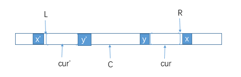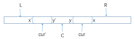 cur'位置上的字符,所以该位置上能扩的步数我们是有记录的(pArr[cur']),也就是说cur'+pArr[cur']处的字符y'是不等于cur'-pArr[cur']处的字符x'的。根据R和C的定义,整个L到R范围的字符是关于C对称的,也就是说cur能扩出的最大回文子串和cur'能扩出的最大回文子串相同,因此可以直接得出pArr[cur]=pArr[cur']。 -