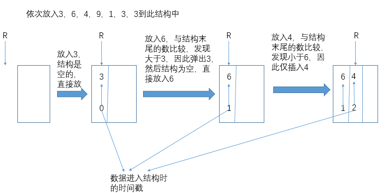 当向此结构放数据时会检查一下结构中的已有数据,从时间戳最大的开始检查,如果检查过程中发现该数据小于即将放入的数据则将其弹出并检查下一个,直到即将放入的数据小于正在检查的数据或者结构中的数据都被弹出了为止,再将要放入的数据放入结构中并盖上时间戳。如此每次从该结构取数据时,都会返回结构中时间戳最小的数据,也是目前为止进入过此结构的所有数据中最大的那一个。
