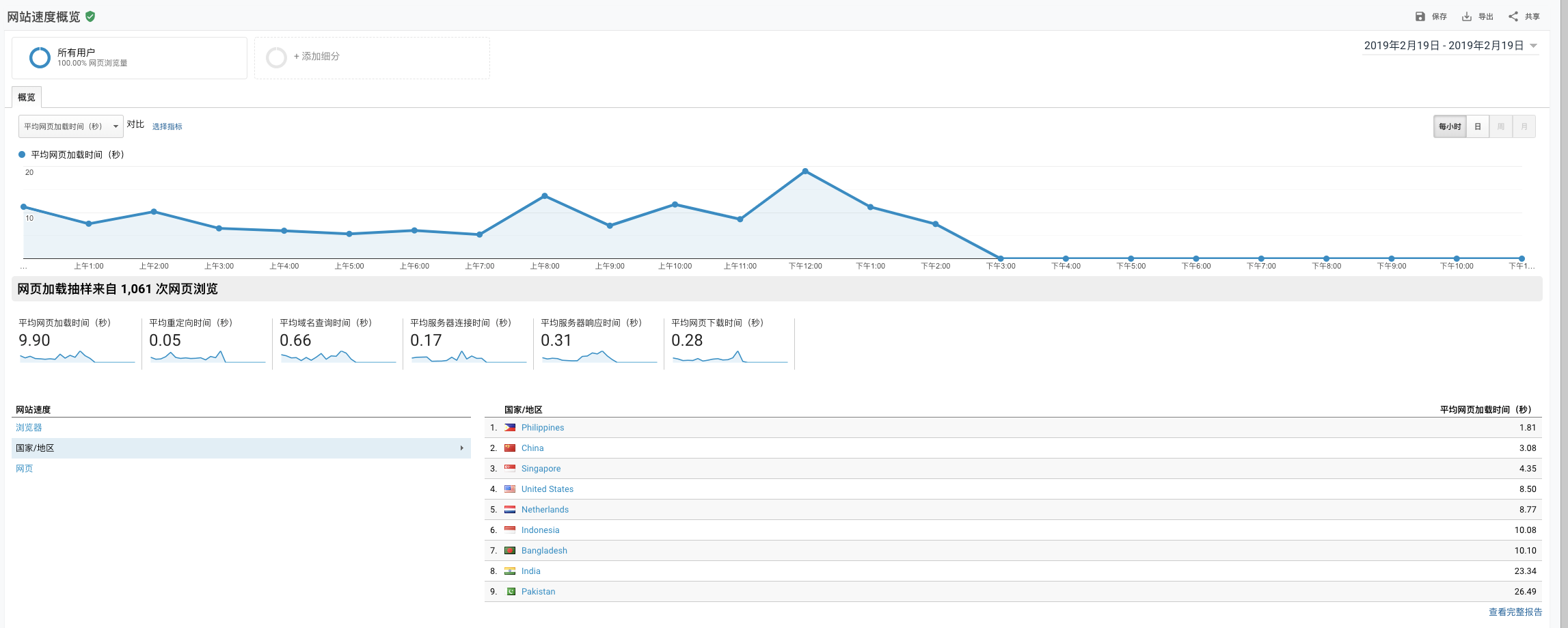 上线后,基本测试没有问题,打开也挺顺畅。但是google analytics却反馈加载平均19s!