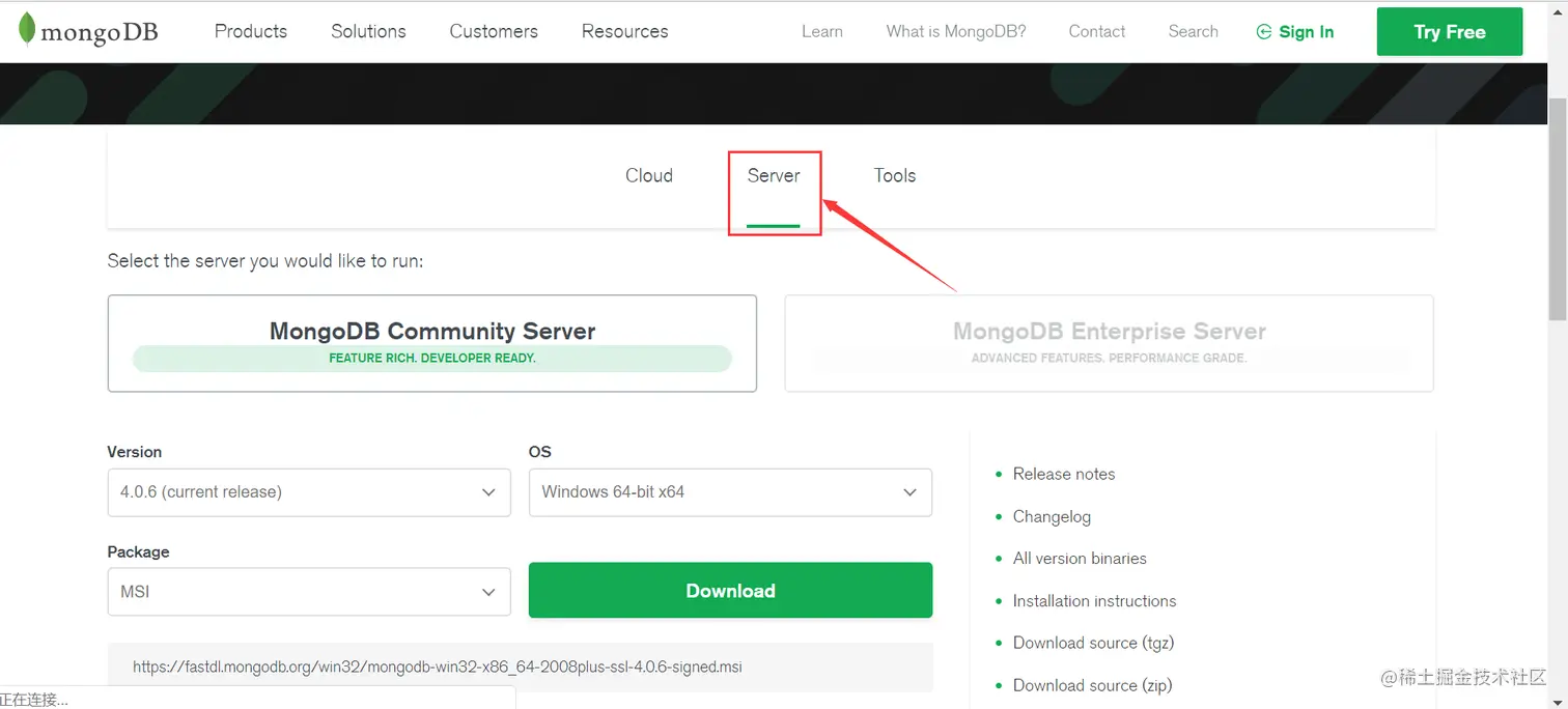 www.mongodb.com/download-ce…进入页面,点击Server,根据自己的本地的环境下载相对应的mongodb安装包