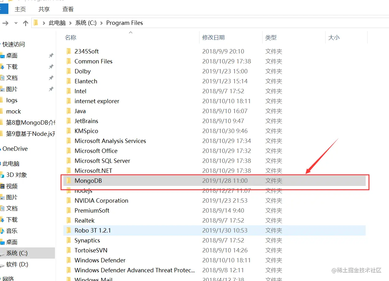 安装完成后在C盘的Program Files文件夹下有个MongoDB文件夹