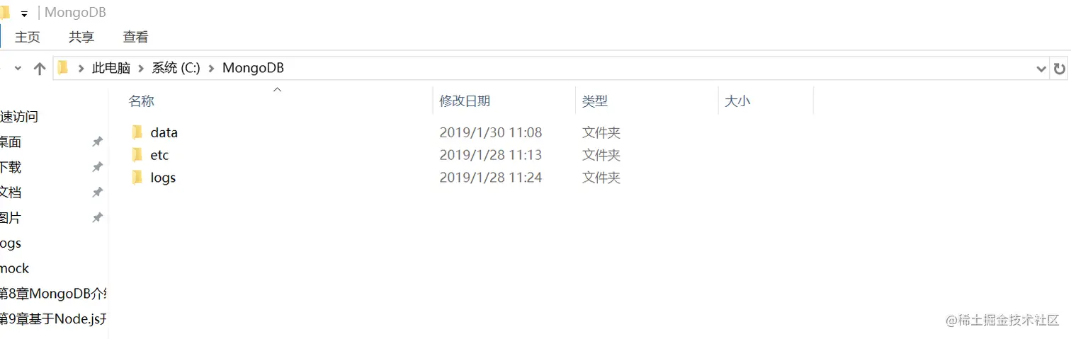 我们在C盘根目录下创建一个文件夹MongoDB,在MongoDB文件夹下创建data、etc、logs文件夹