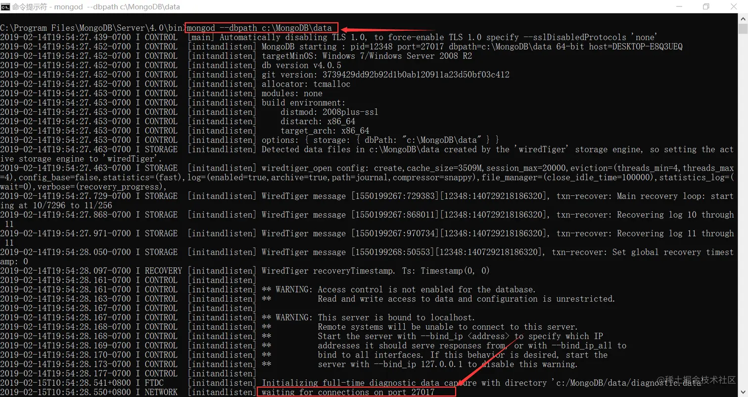 看到 waiting for connections on port 27017 等,说明启动成功,紧接着,我们可以测试一下。