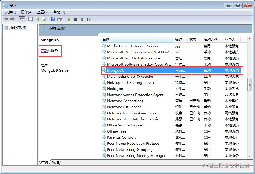安装成功后,打开window服务,我们可以看到里面已经安装了MongoDB