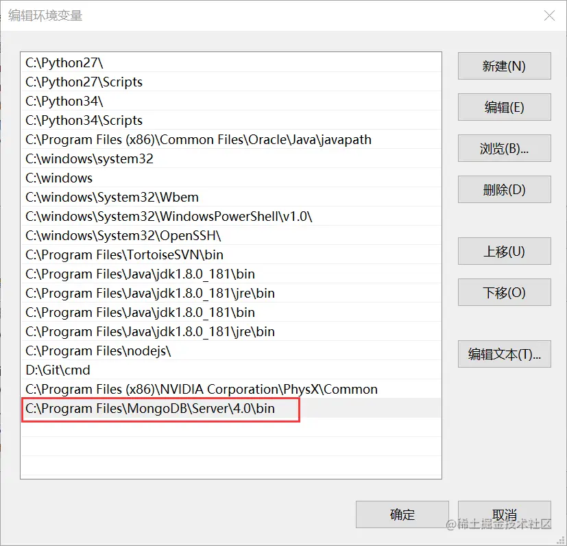 4.找到系统的环境变量,打开path ,在里面输入 ;C:\Program Files\MongoDB\Server\4.0\bin (注意,前面有个分号)