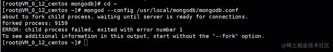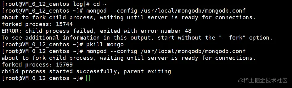 3、如果事先启动了mongo,再通过 mongod --config /usr/local/mongodb/mongodb.conf