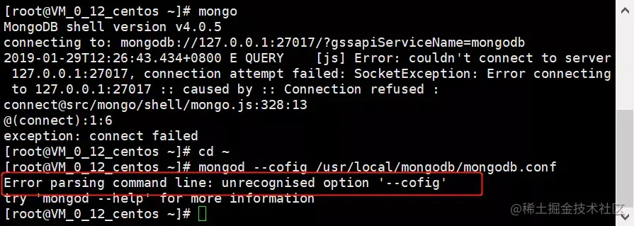 报错意思是不识别cofig,原来我启动命令敲错了,mongod --config 的config少敲了n字母。