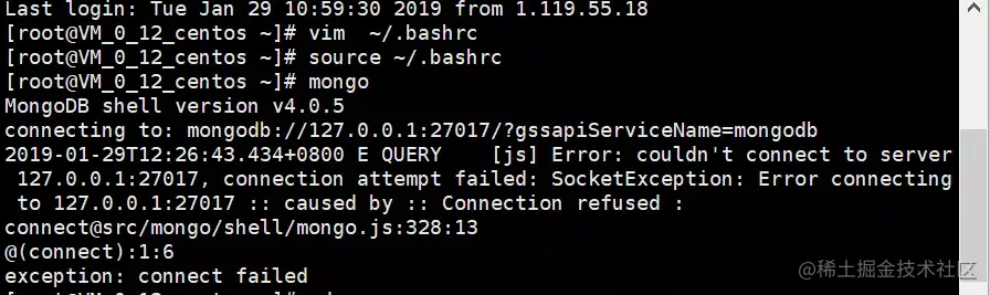 如果没启动服务,但配置成功如果输入mongo,会显示如下