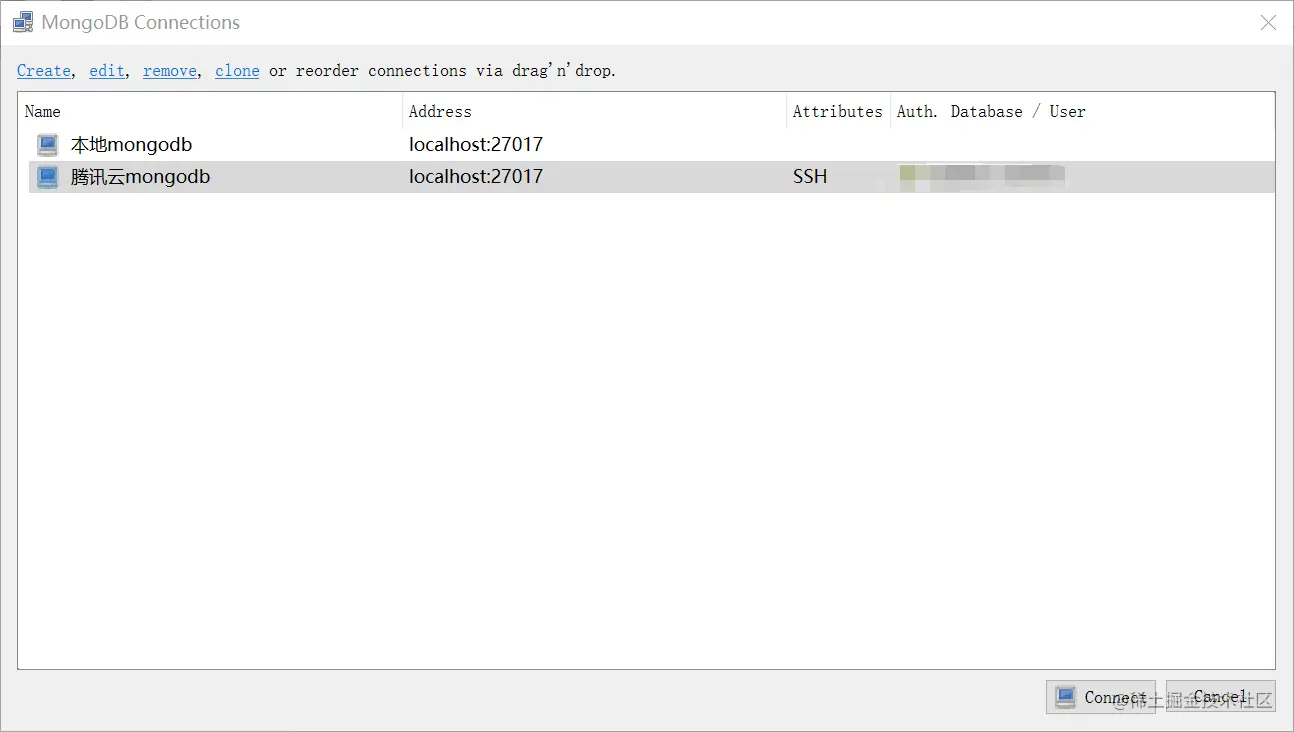 温馨提示:我的环境是腾讯云自带的CentOS7.4 x64 镜像,本地环境是win10 x64 专业版,ssh工具是用的win10 自带的cmd, 远程工具版本是Robo 3T 1.2.1 。