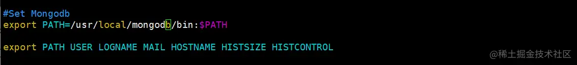 添加配置信息: export PATH=/usr/local/mongodb/bin:$PATH (中间那部分就是你的安装目录下的bin)