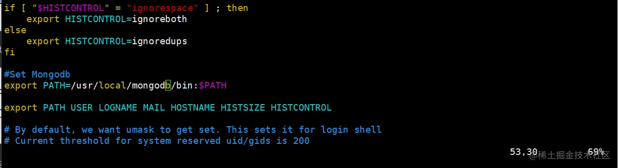 在 export PATH USER LOGNAME MAIL HOSTNAME HISTSIZE HISTCONTROL 一行的上面添加如下内容: