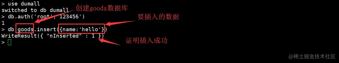 下面我们创建一个新的数据库,如步骤命令下图所示:然后给创建的dumall数据库创建了一个集合goods(对应mysql的table数据表,mongodb成为集合),然后插入数据,如下图: