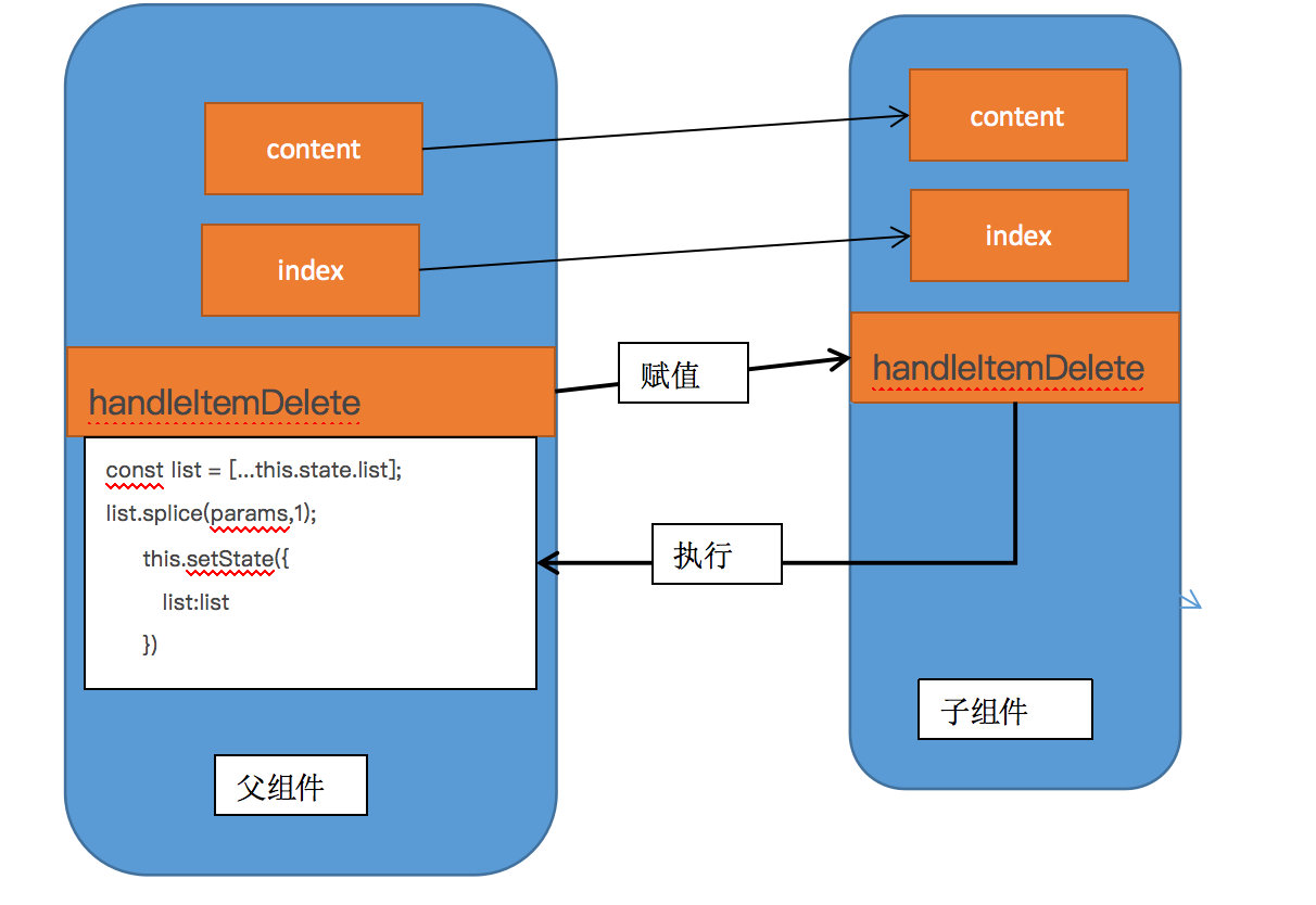 父组件通过给子组件的属性传值,包括把内容显示的值以及index还有方法都通过属性传到子组件中,子组件在自身div中通过属性去获取值进行显示,如果是碰到方法,那么也是通过属性去调用这个方法,但是这个方法的执行却是在父组件中