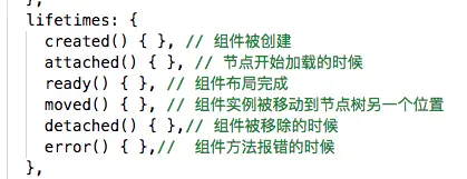 properties: 组件的对外属性 data: 组件的内部数据 组件生命周期:生命周期有优先级,一般情况下直接当作普通方法,但是如果需要优先级的时候,可以写到lifetimes对象里面