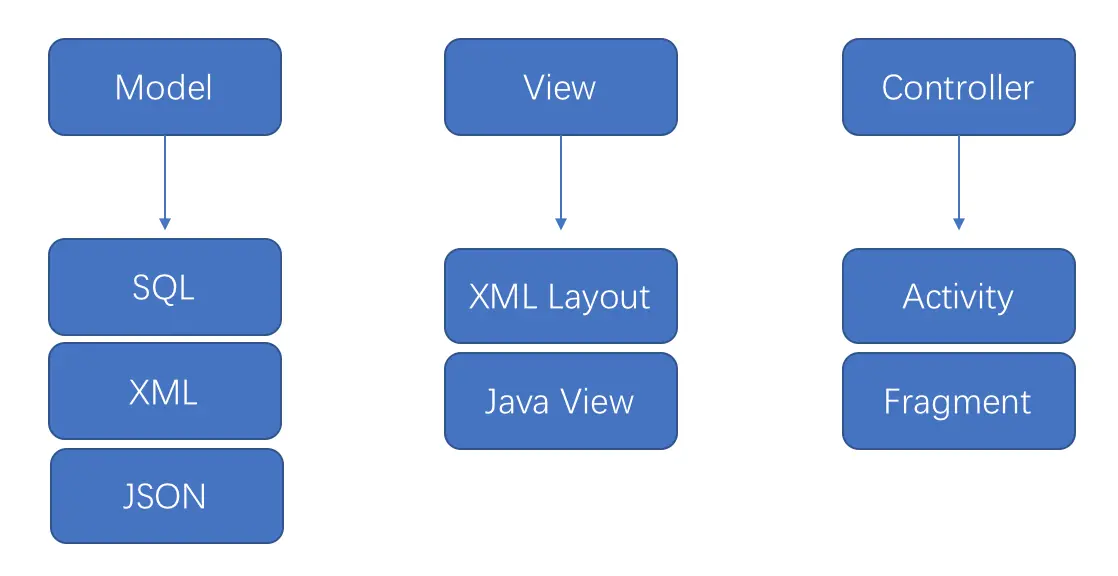 箭头→代表的是一种事件流向,并不一定要持有对方,比如上图中model→view的事件流向,view可以通过注册监听器的形式得到model发来的事件。在设计中model view controller之间如果要通讯,尽量设计成不直接持有,这样方便复用。也符合mvc的设计初衷 在android中三者对应的关系如下: